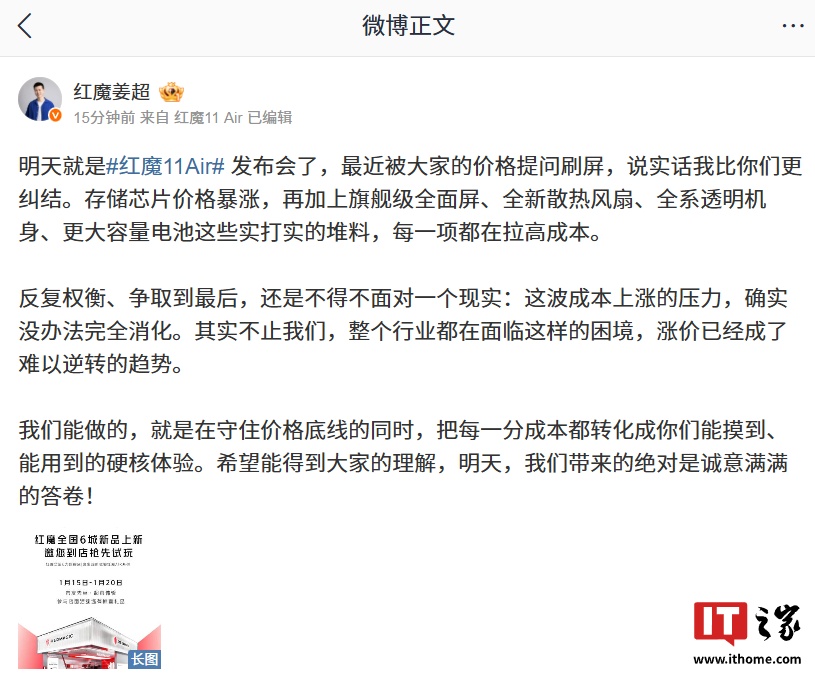 IT之家 1 月 19 日消息,红魔 11 Air 手机将于明日发布,红魔游戏手机产品总经理姜超今日发文回应了关于价格的提问,称存储芯片价格暴涨,再加上旗舰级全面屏、全新散热风扇、全系透明机身、更大容量电池这些堆料,每一项都在拉高成本。