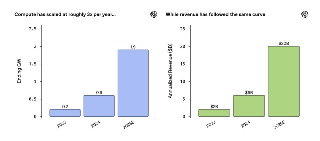 根据报告中的数据,2023到2025年间,OpenAI算力增长9.5倍,收入也呈现出相同的增长曲线,同比增幅达到三倍,三年内增长了10倍。