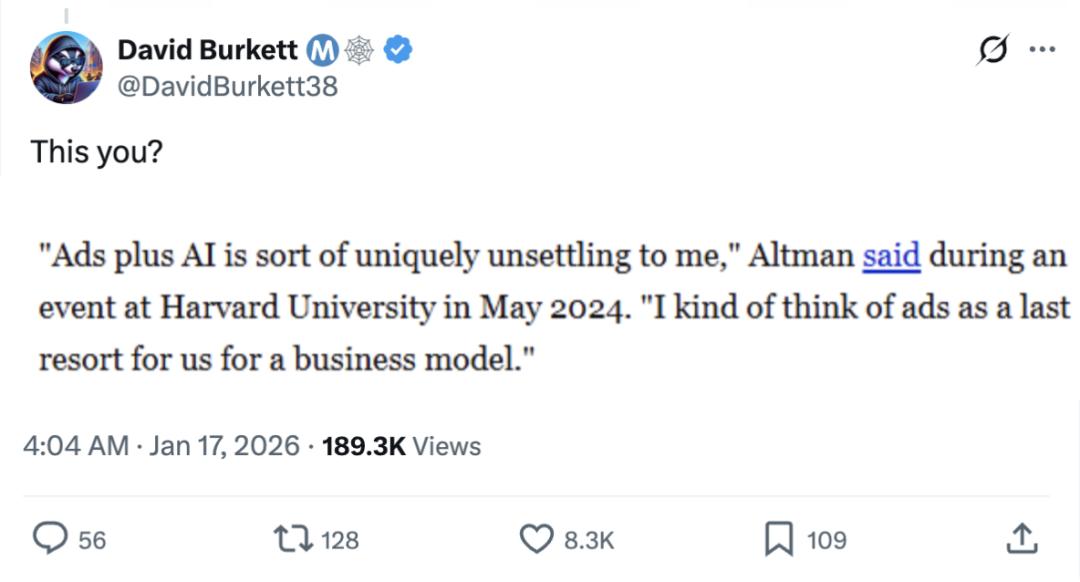 网友们的火力全开,而奥特曼当年关于“广告是ChatGPT最后的救命稻草”的表态,也像回旋镖一样飞了回来,狠狠地砸在自己头上。