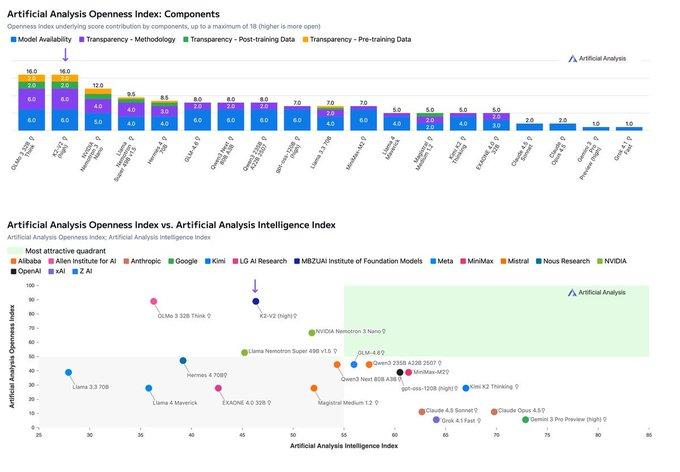根据Artificial Analysis的数据,目前全球开放程度排名前三的模型分别来自NVIDIA(Nemotron 3)、Allen Institute(Olmo 3)和穆罕默德·本·扎耶德人工智能大学(MBZUAI,K2-V2)。
