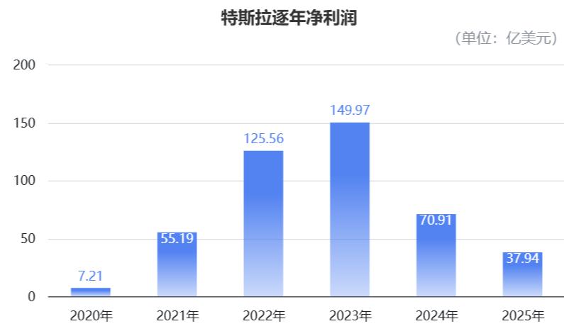 2025年,特斯拉GAAP净利润37.94亿美元,相较2024年的71亿元下降46%,近乎腰斩;非GAAP净利润58.58亿美元,同比下降26%。