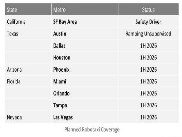 今年上半年,特斯拉正计划扩大Robotaxi服务范围,拓展到美国达拉斯、休斯顿、凤凰城、迈阿密等城市。