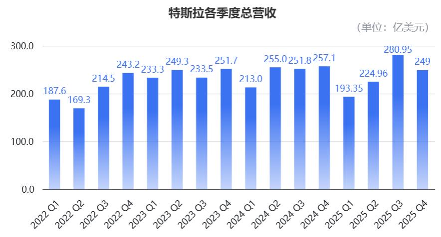 2025年第四季度,特斯拉营收为249亿美元,同比也下降了3%。细分收入来源: