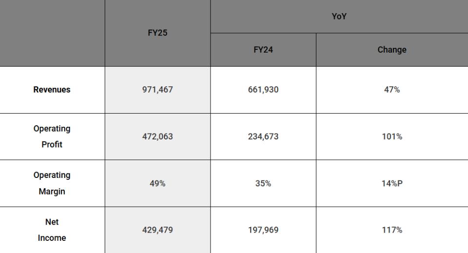 全年营业利润突破47万亿韩元(约合350亿美元),同比增长超过一倍。第四季度表现尤为突出,营收环比增长34%,营业利润环比激增68%,营业利润率高达58%。
