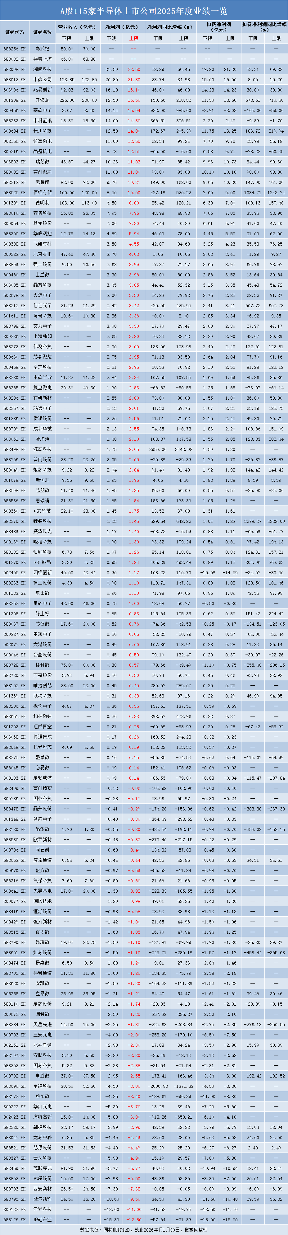 近期,A股半导体行业上市公司2025年半年度业绩预告陆续披露。截至2026年1月30日,已披露业绩相关内容的115家公司中,有113家公布了具体预告。其中,70家企业预计实现盈利,合计净利润约313.88亿元;43家企业预计亏损,累计亏损约117.45亿元。