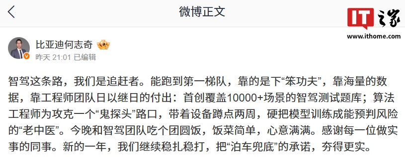 IT之家 2 月 9 日消息,比亚迪股份有限公司执行副总裁何志奇昨晚发文谈及了智驾的发展。他表示,智驾这条路,比亚迪是追赶者。能跑到第一梯队,靠的是下“笨功夫”,靠海量的数据,靠工程师团队日以继日的付出。