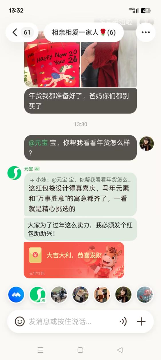 家庭派里正在讨论年货,元宝突然发出 “ 年货红包 ” 助兴。AI 红包如同一个机关,让派里瞬间有了新的话题和热闹。