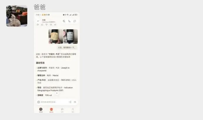 “ 虽然是通过红包的形式让爸妈下载了元宝,但没想到他们真的开始用了。” 最近编辑部的一位同事表示,临近过年,她给家里寄了两瓶没有中文标签的法国红酒,没想到爸爸收到酒之后上来就先用元宝翻译了一下。