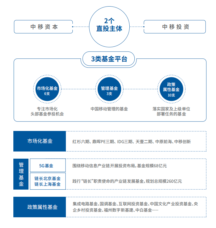 需要强调的是,在中国移动众多专业公司当中,中移投资(控股有限责任公司)和中移资本(控股有限责任公司)是两个直投主体。二者均成立于2016年底,作为中国移动股权投资和资本运作的集中管理平台,聚焦国家战略和集团主业,大力开拓具有中移特色的资本运营新路,打造中国移动创新发展和助力经济社会数智化转型的新动能。