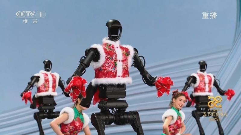 2025年1月28日,蛇年春晚,16台宇树机器人身着东北花袄,攥紧红手帕,扭起了秧歌。