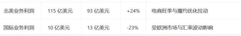 同期,亚马逊国际电商实现营收507亿美元,同比增长17%,营收增速高于北美地区,主要受益于新兴市场的业务拓展及海外电商渗透率提升。受海外市场竞争加剧、物流成本上升及局部地区业务调整影响,亚马逊国际业务营业利润同比下降23%至10亿美元,盈利能力相对微薄,整体上看仍处于业务优化阶段。