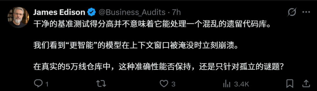 还有人提出,技术基准测试得分提高,也不意味着能驾驭现实中混乱的代码库。很多所谓更聪明的模型,在上下文窗口被塞满后,就迅速崩溃了。