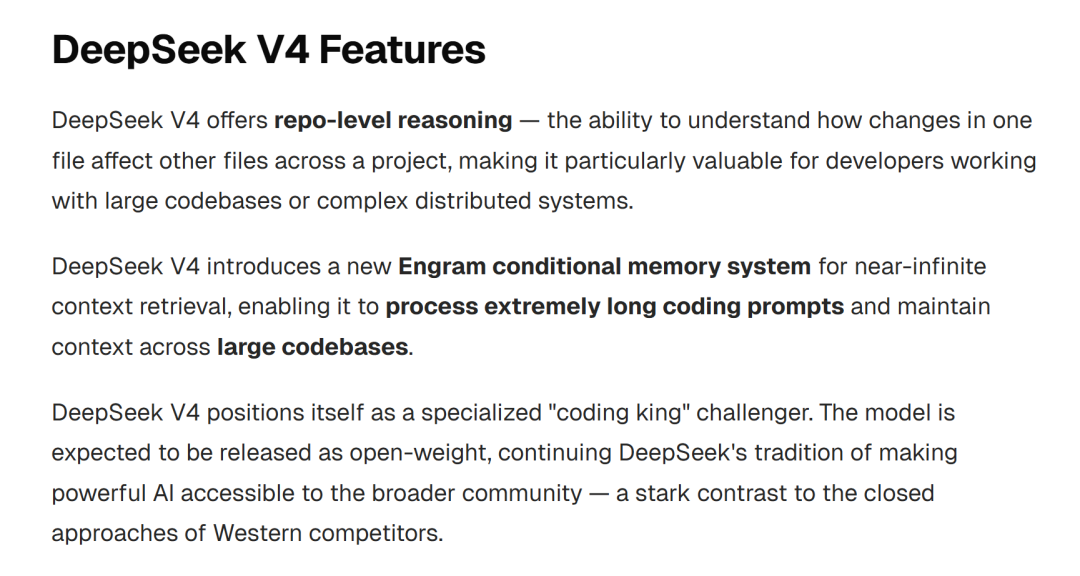 DeepSeek之前的模型,尤其是V3和R1,证明了开源AI模型可以以极低成本与专有模型竞争。V4预计将在这一成功基础上,拥有更令人印象深刻的编码能力。
