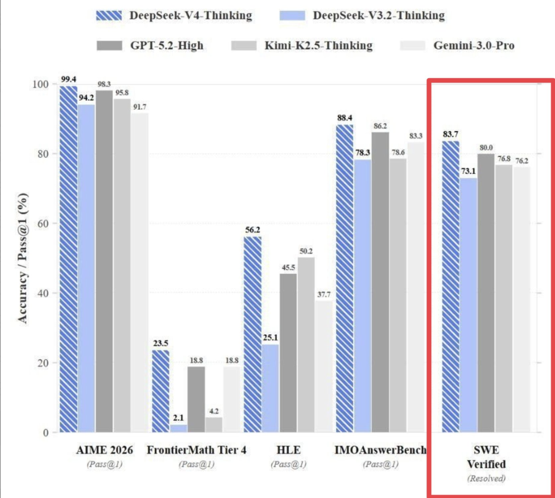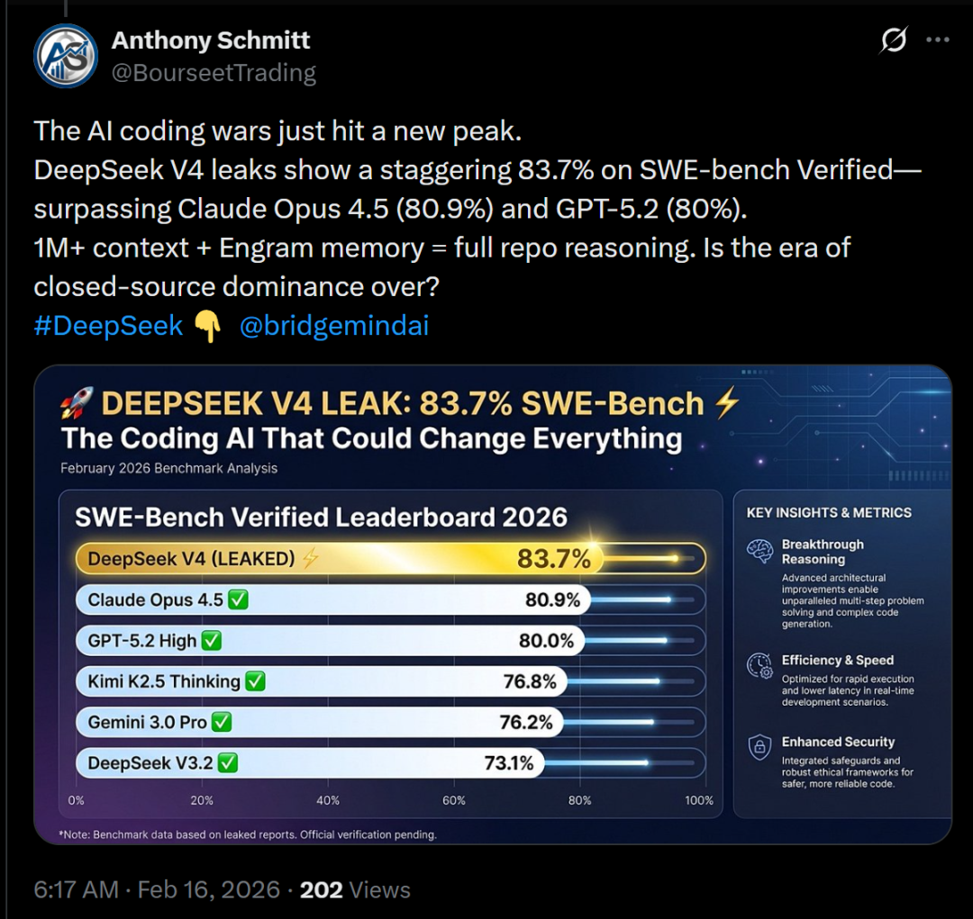 泄露信息显示,DeepSeek V4在SWE-bench Verified上取得了惊人的83.7%,超过了Claude Opus 4.5(80.9%)和GPT-5.2(80%)。