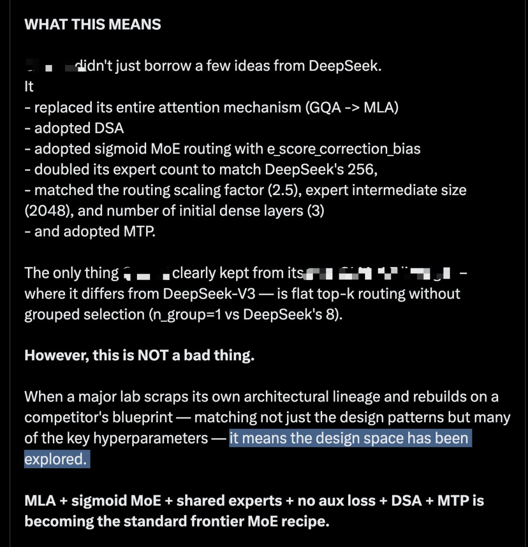 MLA + sigmoid =稀疏专家(MoE)+ 共享专家 + 无辅助损失 + DSA + MTP正成为前沿稀疏专家模型的标准配方。