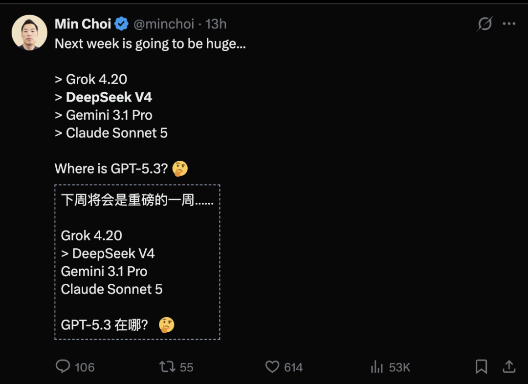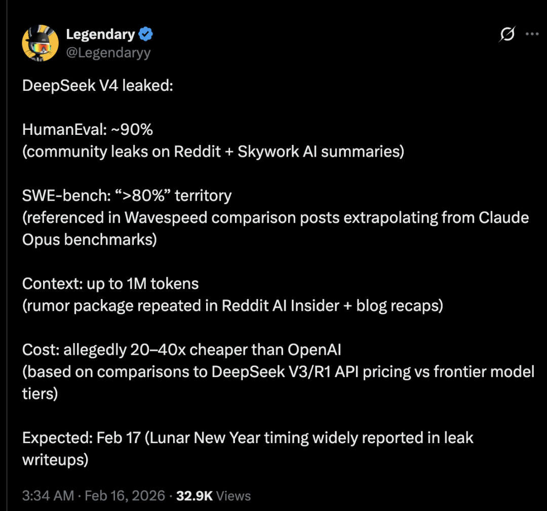 还有网友综合了全网DeepSeek V4消息,不仅在HumanEval、SWE_bench、上下文和成本上刷新成绩,而且发布时间预计在春节,也就是明天!