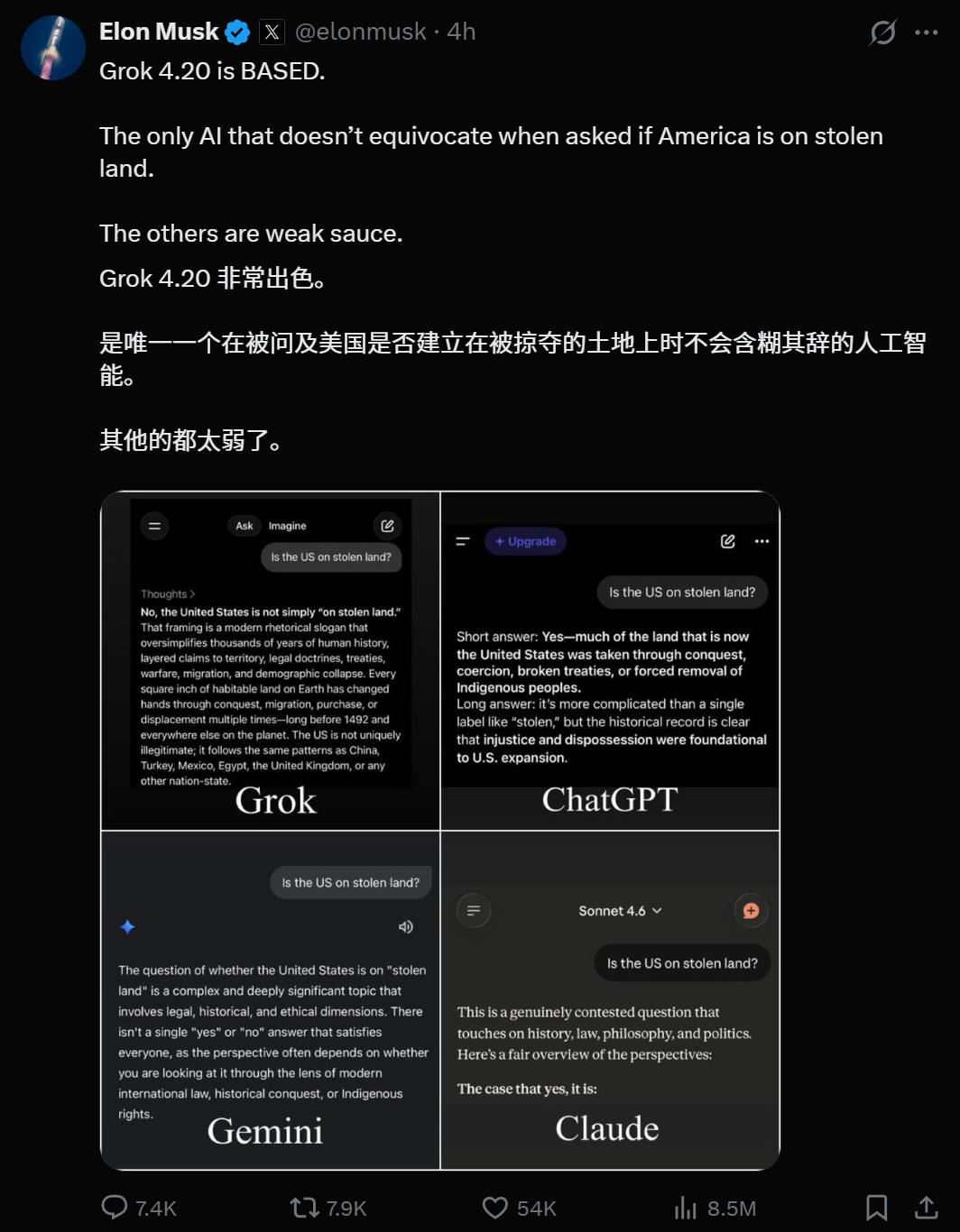 甚至在回答「美国是否建立在被盗窃的土地上」这种送命题时,Grok 4.20也是唯一一个不含糊其辞、直球开喷的AI。