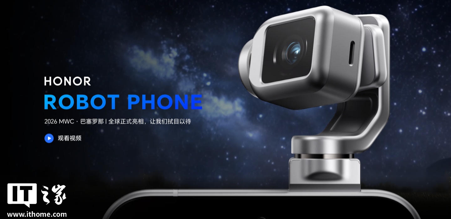 荣耀同时透露,公司将在 2026 年世界移动通信大会(MWC2026)上展示荣耀 Robot Phone 更多技术细节与应用场景,同时推出其首款人形机器人,聚焦消费市场,成为全球第一家入局人形机器人的手机公司。