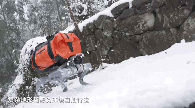按照宇树的介绍,该机器人能在复杂地形和恶劣环境自如行走,如下面动图所示,即便驮着一大包负重物,在冰天雪地里额大上坡上,该机器人也能够顺畅的行走,甚至奔跑起来。