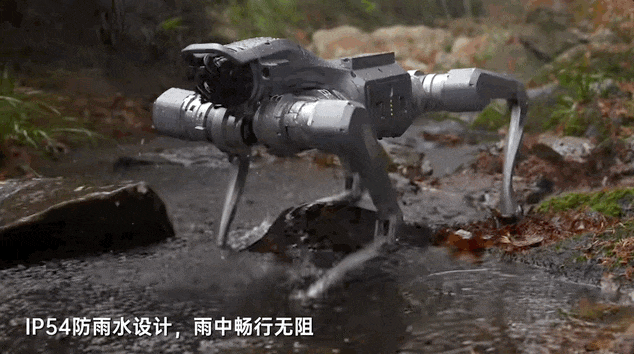 同时,Unitree As2采用IP54防雨水设计,从视频画面可见,该机器人在莫过机器人小腿的水坑中行走,依然畅通无阻。