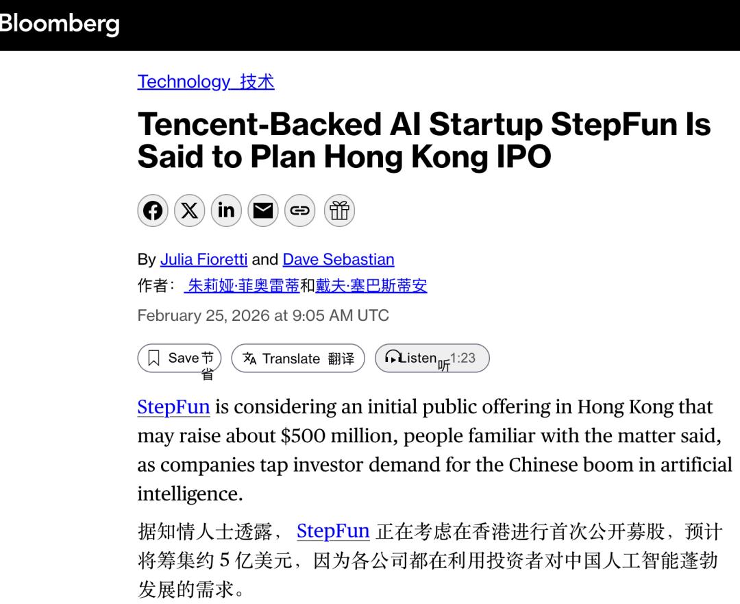 智东西2月25日消息,刚刚,外媒彭博社援引知情人士报道,上海大模型明星创企阶跃星辰正考虑在港交所IPO,计划筹集约5亿美元(约合人民币34亿元)。