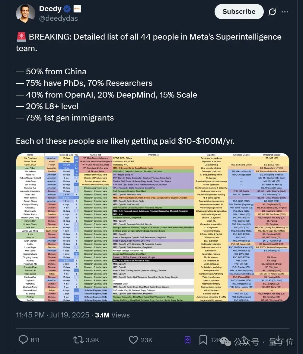 去年7月份,硅谷VC大佬Deedy从一位匿名Meta员工手中获取了一份Meta超级团队人员名单。44人中,几乎有40%的人都来自OpenAI。OpenAI还是被挖得最狠的。