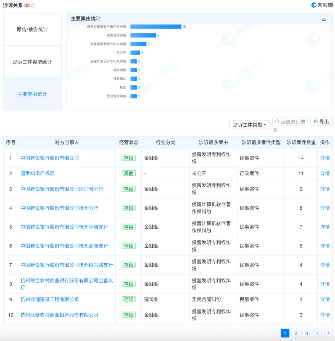 进一步分析,建林电气起诉的银行多达20家,包括中国建设银行、以及建设银行在杭州、上海、北京的多个分行、支行,例如中国建设银行杭州西湖支行、中国建设银行杭州萧山支行、中国建设银行杭州高新支行等,以及浙江萧山农村商业银行、杭州联合农村商业银行文新支行等。起诉理由均为侵害发明专利权纠纷或侵害计算机软件著作权纠纷。
