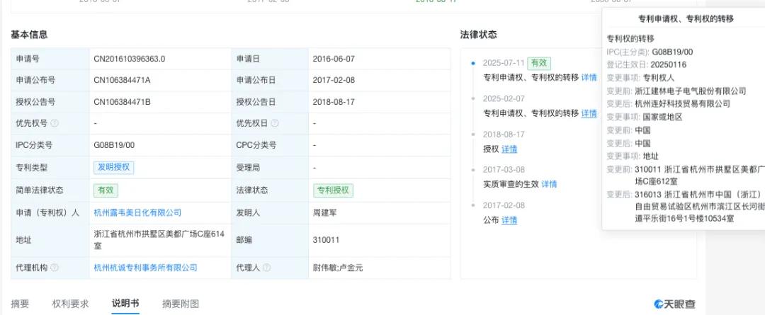 天眼查显示,这项“电子狗”专利最初为浙江建林电子电气股份有限公司(下称“建林电气”)持有。2025年2月7日, 建林电气将该专利转让给 杭州连好科技贸 易有限公司,7月11日, 连好科技又转让给如今的露韦美。
