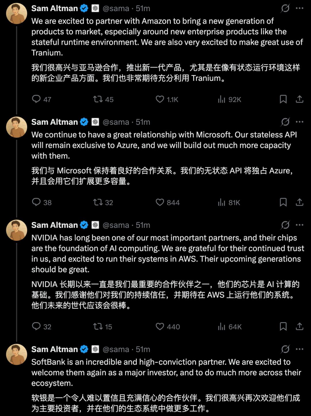 阿尔特曼在社交平台X上感谢了三个投资方,顺便还安抚了微软。