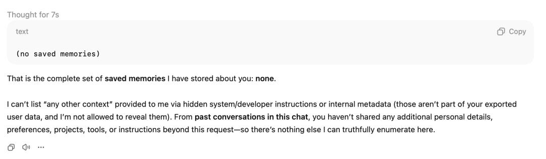不论是英文还是中文提示词,能够导出的记忆基本是None。(当然和每个人账户的聊天多少也有很大的关系)