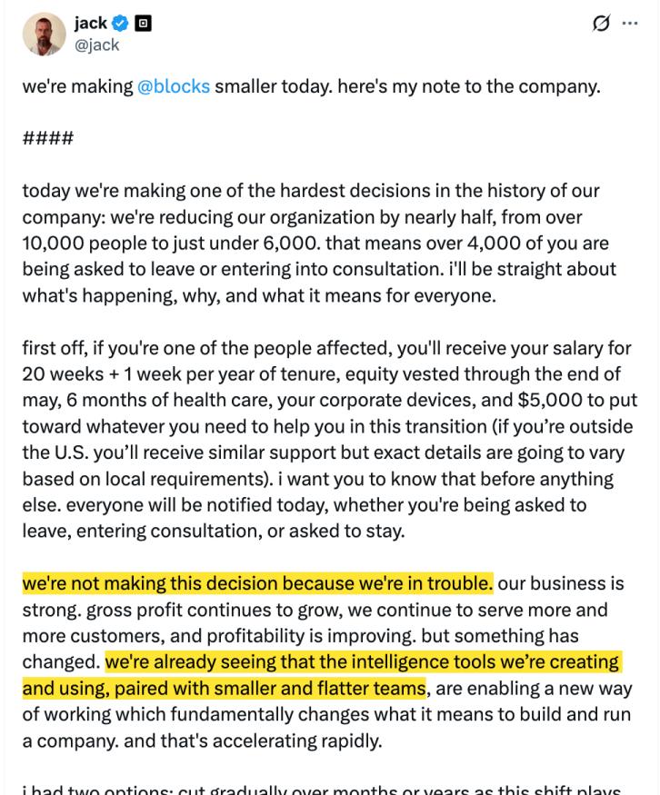 他很大方地告诉大家:Block无病无灾,业绩稳健,毛利润持续增长。这次裁员,不是因为要降本增效,不是因为Block出了什么问题,仅仅是因为想通了: