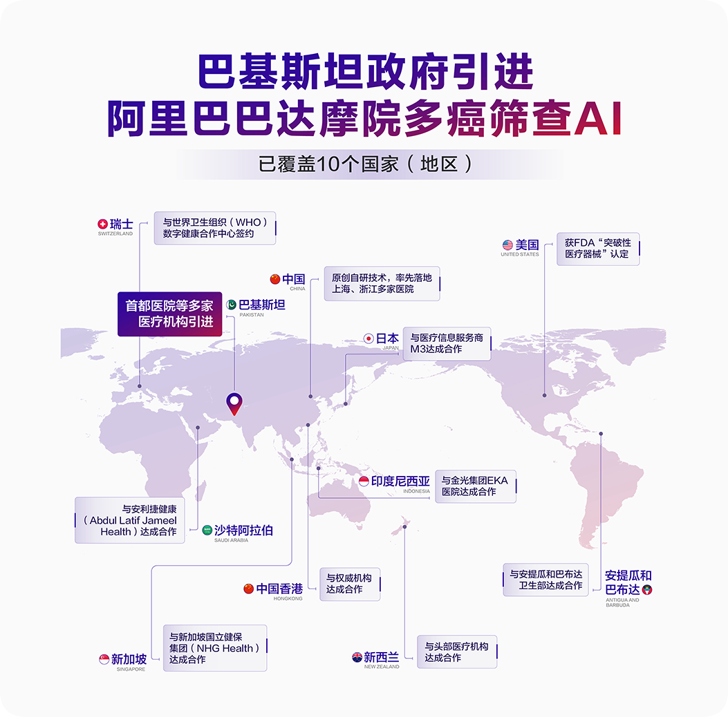 巴基斯坦信息技术和通信部部长莎萨·法蒂玛·赫瓦贾曾在中国访问时了解到达摩院多癌筛查AI,随后积极推动引入。她表示:“巴基斯坦正在构建一个包容的人工智能创新生态,医疗健康更是巴基斯坦首个国家人工智能政策(National AI Policy)的优先关注领域。这项中国技术非常契合巴基斯坦的需求,我们欢迎像阿里巴巴这样的领先企业带来前沿AI,惠及更多民众。”