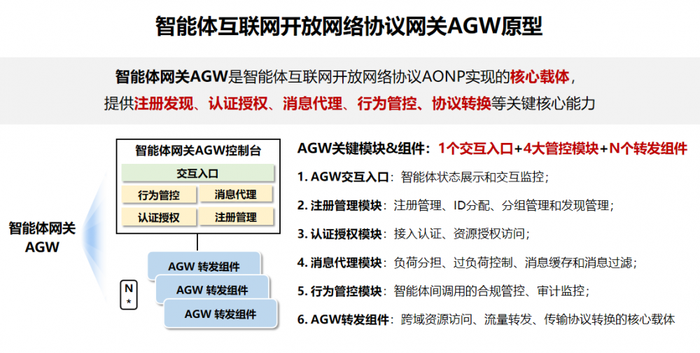 此外,中国移动研究院自主研发了AONP协议框架实现的核心载体——智能体网关AGW原型,包括“1+4+N”核心模块和组件。1个网关核心交互入口,注册管理、认证授权、消息代理、行为管控4大管控模块,以及N个可分布部署在开放网络环境中的AGW转发组件。智能体网关AGW通过中心与分布式协同控制实现AONP协议关键能力,使能智能体互联网全域互联、高效管控与安全运行。