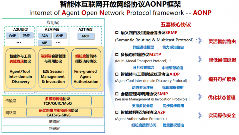 五项协议构成协议簇框架,从网络基础能力优化、端到端、跨域通信保障等维度为多智能体互联协作提供了更全面的能力组合。