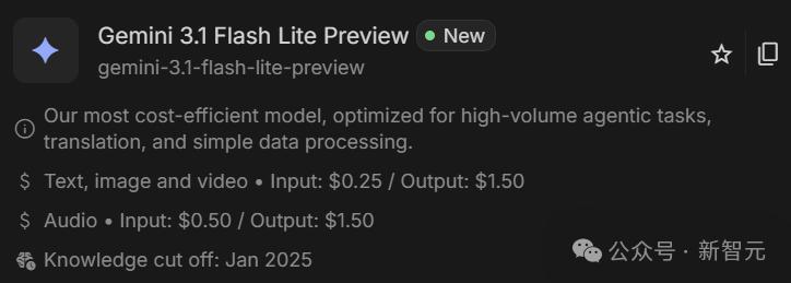 3.1 Flash-Lite输入0.25美元/百万Token、输出1.50美元/百万Token。