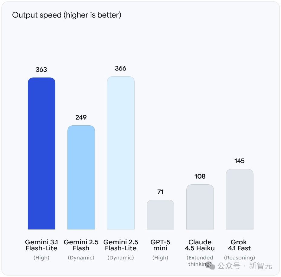 3.1 Flash-Lite的输出速度达到363 tokens/s,跟自家2.5 Flash-Lite(366 tokens/s)几乎持平,但把上一代Gemini 2.5 Flash(249 tokens/s)远远甩在了身后。