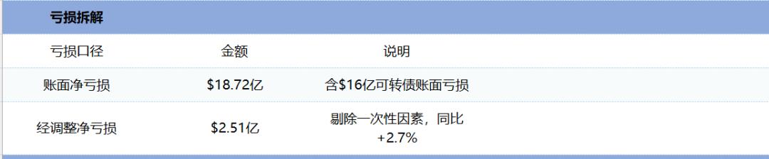 亏损的数字看起来确实吓人。全年净亏损18.72亿美元,但这里面包含了16亿美元可转债转股带来的账面亏损。剔除这一因素后,经调整净亏损为2.51亿美元,同比微增2.7%。
