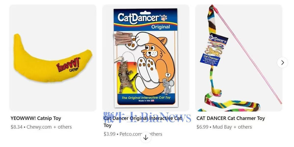 假设你向聊天机器人询问最受欢迎的猫玩具。人工智能会返回一个横向轮播图,展示所有产品,包括价格、品牌信息以及购买网站。