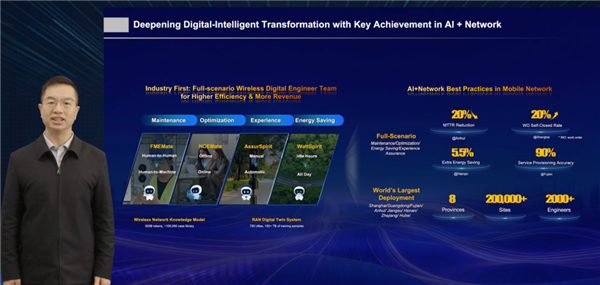 依托中国移动全球最大规模的5G/5G-A网络底座,双方在上海、安徽等八省市建成无线高阶自智网络示范区,无线网络智能体已覆盖20万站点、100万小区,助力超2000名网络工程师,将AI+网络全面融入生产流程。