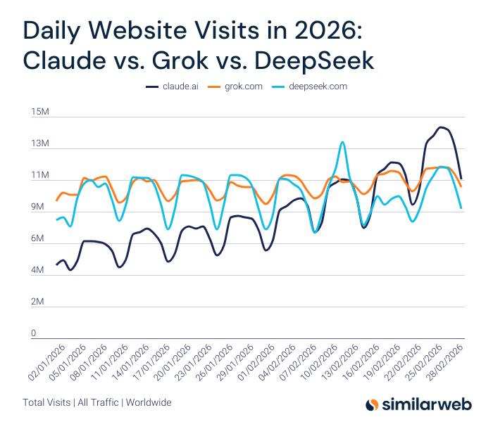 Similarweb最新统计显示,Claude.ai在二月的下半月正在加速狂飙,流量远超Grok、DeepSeek。