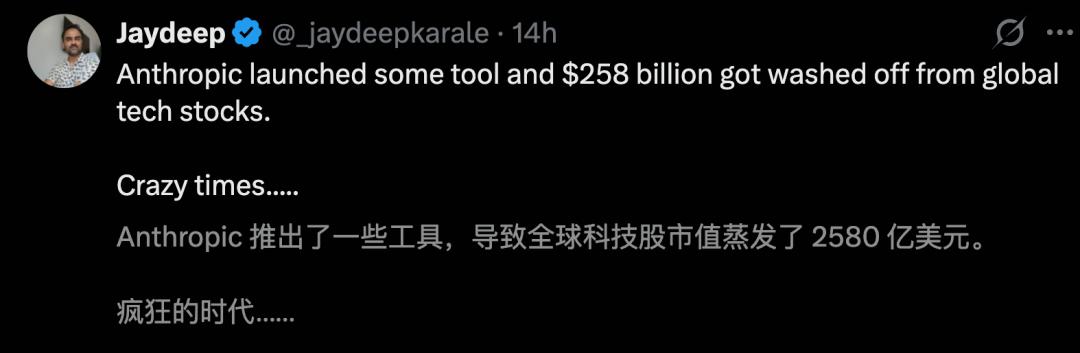 2月份,Claude Cowork相继杀出,十几个插件的更新,让全球软件股巨崩,市值蒸发近万亿。