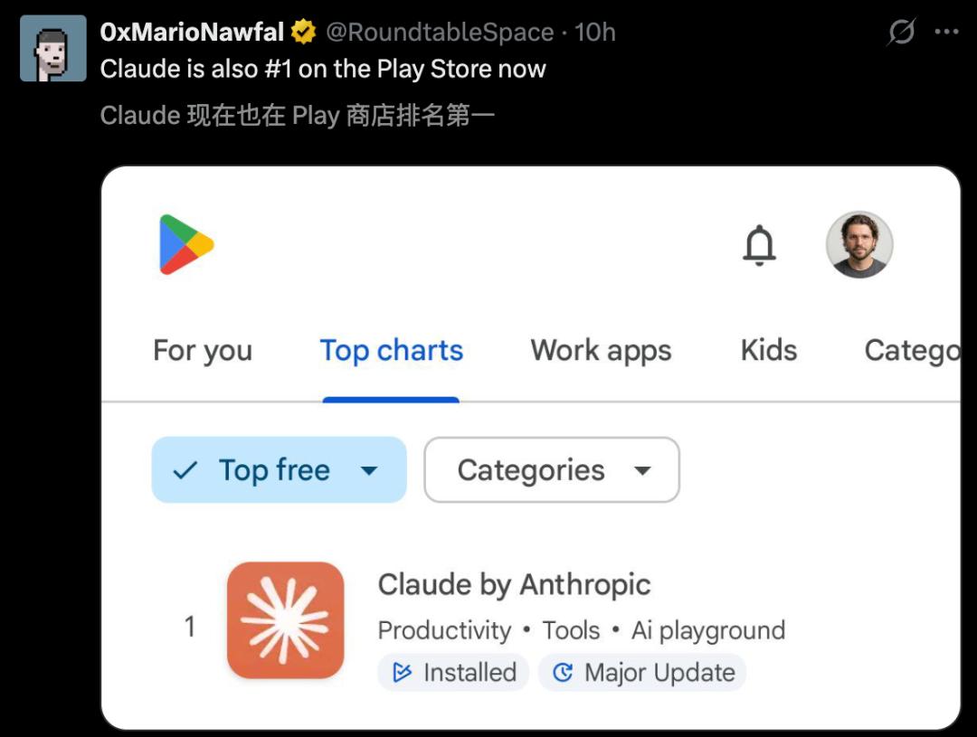 在Google Play、美区、加拿大、法国等地App Store下载榜上,Claude应用一骑绝尘。
