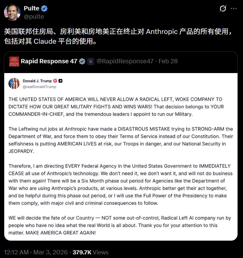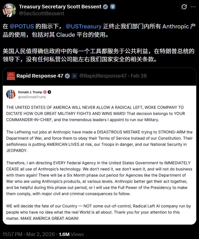 全美所有联邦政府机构,要在6个月内,全部撤除与Anthropic的合同。