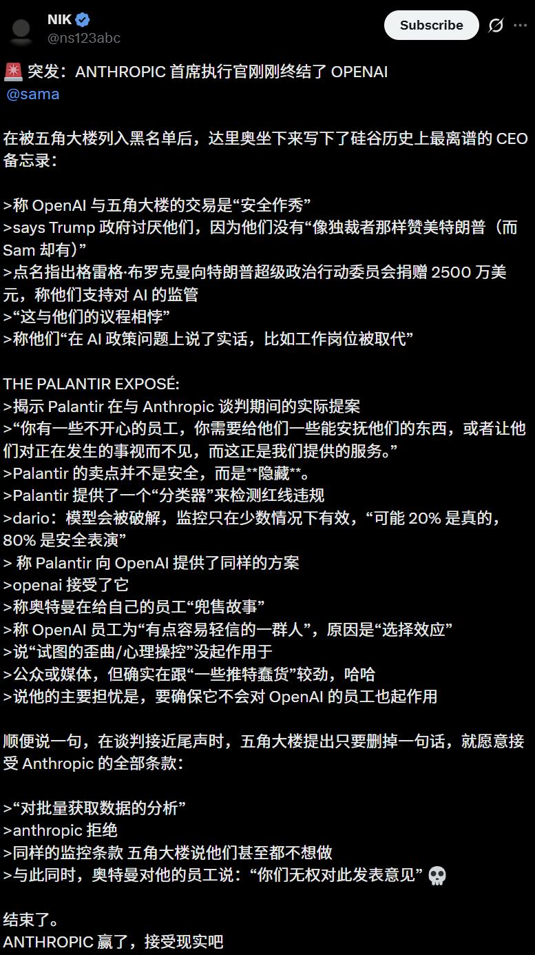 Amodei表示,在Anthropic处境艰难之际,奥特曼趁虚而入,试图通过削弱公众支持,让政府更有底气对我们下狠手。