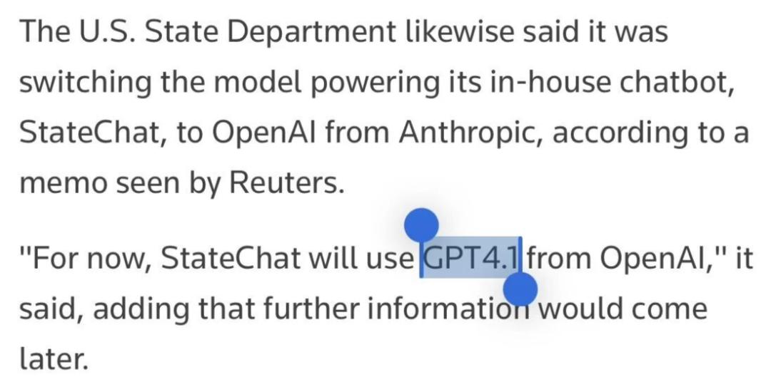 美政府自研聊天机器人StateChat,连夜将底层的大模型从Claude切换到了GPT-4.1。