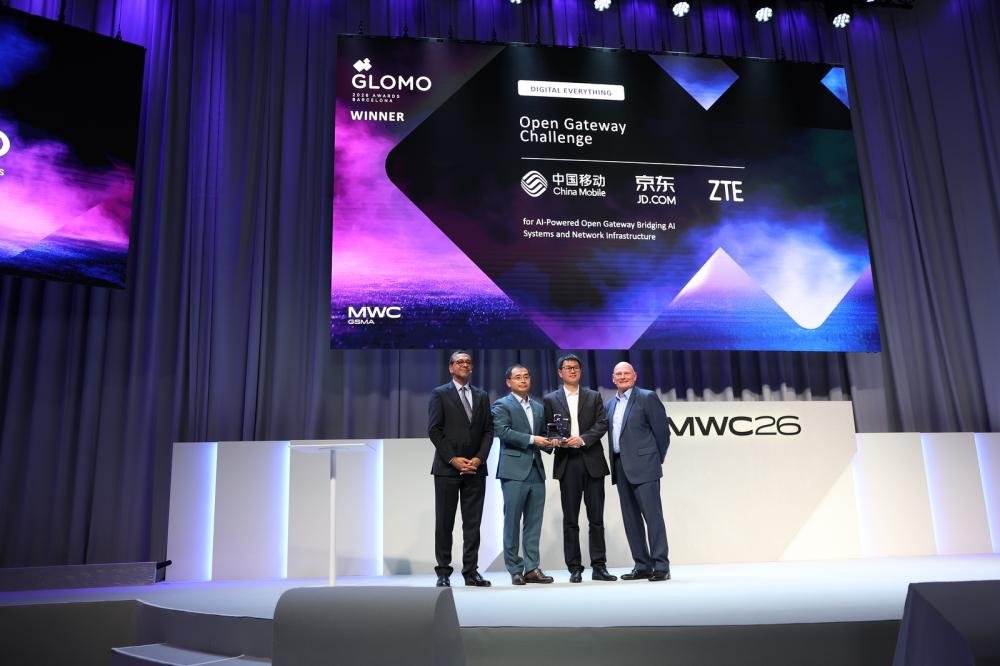 世界移动通信大会(MWC26巴塞罗那)期间,由中国移动集团网络事业部、中国移动杭州研发中心、京东集团与中兴通讯联合打造的AI-Powered Open Gateway解决方案,凭借领先的技术创新与标杆实践价值,斩获GSMA全球移动大奖(GLOMO)——“开放网关挑战奖”。