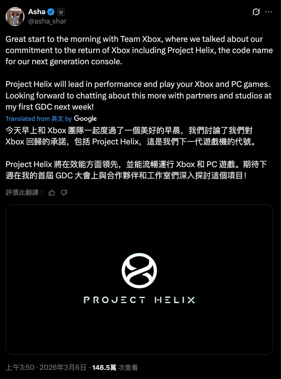 IT之家 3 月 6 日消息,微软 Xbox 部门新掌舵人阿莎 · 夏尔玛(Asha Sharma)昨天在 X 平台表示,他们已经在讨论下一代 Xbox 主机“Project Helix”。