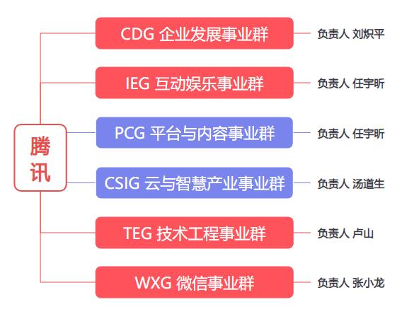 MIG(互联网事业群)、OMG(网络媒体事业群)、SNG(社交网络事业群)全部打散,to C部分被收编进新设的PCG(平台与内容事业群)、to B部分收入CSIG(云与智慧产业事业群)中。