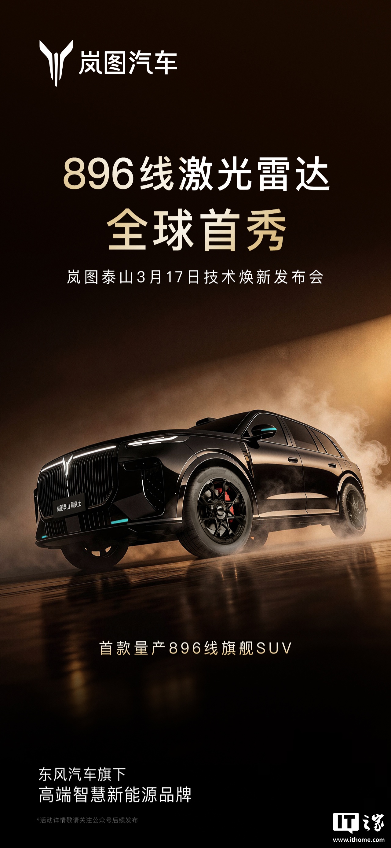 IT之家 3 月 6 日消息,岚图汽车已官宣将在 3 月 17 日举行岚图泰山技术焕新发布会 ——《远见》,届时将带来首款量产 896 线旗舰 SUV。
