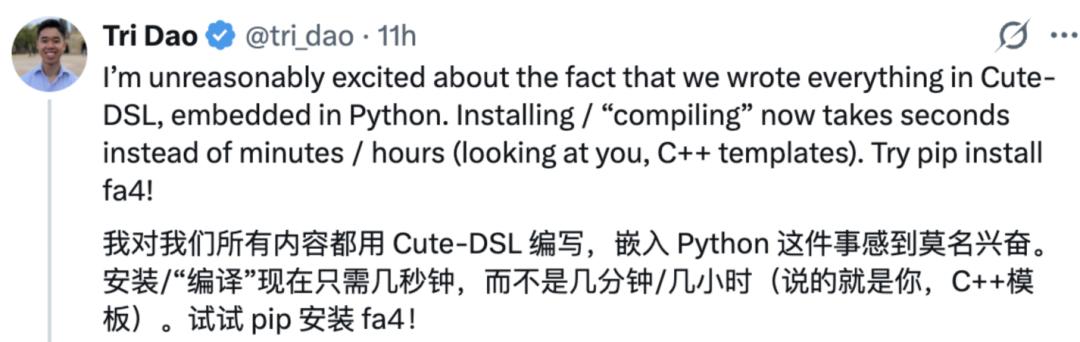 对此,Tri Dao 更是在 X 上发帖称感到「莫名兴奋」,这意味着,安装 /「编译」现在只需几秒钟,而不是几分钟 / 几小时。